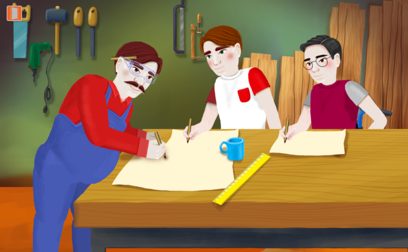 Tym razem dzieci przeniosą się do warsztatu, w którym poznają dwóch przyjaciół: Marka i Arka. Chłopcy oprowadzą nas po stolarni, w której pracuje tata jednego z nich. Uczniowie będą mieli okazję zapoznać się procesem obróbki drewna. Będą musieli ruszyć głową i uruchomić wyobraźnię, aby rozwiązać rebusy i odgadnąć nazwy drzew oraz zwierząt. Nie zabraknie też okazji do ćwiczeń czytania ze zrozumieniem oraz wyodrębniania samogłosek i spółgłosek w odczytanych wyrazach. Gra wyposażona jest też w planszę relaksacyjną, podczas której uczniowie odnajdą narzędzia stolarskie ukryte pod wiórami. Dodatkowym atutem gry jest oswajanie dzieci z tematem niepełnosprawności ruchowej.